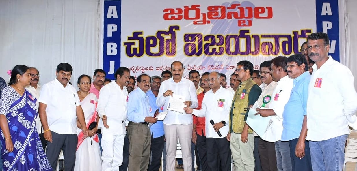 విజయవాడ : జర్నలిస్టుల పట్ల తమ ప్రభుత్వానికి సానుకూలతే ఉందని.. వివిధ సందర్భాల్లో జిల్లాల్లో జర్నలిస్టు సంఘాల నాయకులు తమ దృష్టికి తెచ్చిన సమస్యలను చర్చిస్తుంటామని.. ముఖ్యమంత్రి దృష్టికి కూడా తీసుకెళ్తుంటామని రాష్ట్ర సమాచార శాఖ మంత్రి కే పార్థసారథి పేర్కొన్నారు. ఆంధ్రప్రదేశ్ వర్కింగ్ జర్నలిస్ట్స్ ఫెడరేషన్ (ఏపీడబ్ల్యూజేఎఫ్), ఆంధ్రప్రదేశ్ బ్రాడ్ కాస్ట్ జర్నలిస్ట్స్ అసోసియేషన్ (ఏపీబీజేఏ) సంయుక్త ఆధ్వర్యంలో బుధవారం నిర్వహించిన “చలో విజయవాడ” కార్యక్రమంలో మంత్రి ముఖ్య అతిథిగా పాల్గొన్నారు. రాష్ట్రవ్యాప్తంగా అన్ని జిల్లాల నుంచీ చాలా పెద్ద సంఖ్యలో హాజరైన జర్నలిస్టులు మహాత్మాగాంధీ రోడ్డు రాఘవయ్య పార్క్ సెంటర్ నుండి తుమ్మలపల్లి కళాక్షేత్రం వరకు భారీ ర్యాలీ జరిగింది. అనంతరం తుమ్మలపల్లి కళాక్షేత్రంలో “ఫెడరేషన్” రాష్ట్ర అధ్యక్షుడు ఎస్.వెంకట్రావు అధ్యక్షతన సభ జరిగింది. రాష్ట్ర నాయకులు తెలిపిన ఆయా సమస్యలపై మంత్రి స్పందిస్తూ సమస్యల పరిష్కారానికి యధాశక్తి కృషి చేస్తానని పేర్కొన్నారు. జర్నలిస్టుల ముఖ్య సమస్యలన్నింటినీ సీఎంతో చర్చించి పరిష్కరించే ప్రయత్నం చేస్తామన్నారు. “జర్నలిస్టులను విస్మరించం.. నిర్లక్ష్యం చేయం” అని తెలిపారు. జర్నలిస్టుల ఆరోగ్య బీమా పథకంలో అంతరం లేకుండా నిరవధికంగా కొనసాగేలా చూస్తానన్నారు. ఏడాదికి రెండుసార్లైనా జర్నలిస్టులకు ఉచిత వైద్య పరీక్షలు నిర్వహించాలన్న విజ్ఞప్తిని ప్రస్తావిస్తూ ఐఎంఏ, పెద్ద ఆసుపత్రుల యాజమాన్యాలతో చర్చించి జర్నలిస్టులకు లబ్ధి కలిగేలా చూస్తామన్నారు. జర్నలిస్టుల సంక్షేమ నిధిని పెంచి ఫలాలు అందేలా.. కార్యాచరణ ఆలోచిస్తామని మంత్రి పార్థసారథి పేర్కొన్నారు. ఈ పథకానికి తాను వ్యక్తిగతంగా ఐదు లక్షల రూపాయలు అందజేస్తానన్నారు. జర్నలిస్టులకు ఇళ్లు.. ఇంటి స్థలాల అభ్యర్థనను ప్రస్తావిస్తూ ఈ వరకే ఉన్న పథకంలో జర్నలిస్టుల్ని కలిపే విషయం సానుకూలంగా పరిశీలిస్తామన్నారు. జర్నలిస్టులపై దాడుల్ని ఖండించి తీరతామన్నారు. జర్నలిస్టుల పిల్లలకు విద్యాసంస్థల్లో ఉచితంగా అసెంబ్లీలో ప్రతిపక్షం లేకున్నా.. మీడియాలో వస్తున్న వివిధ సమస్యలను ప్రభుత్వం చర్చిస్తుంటుందని మంత్రి తెలిపారు. సోషల్ మీడియా, యూట్యూబ్ లలో తరచూ ఫేక్ న్యూస్ వస్తున్నందున మిగతా జర్నలిస్టుల మీద కూడా కొంత విముఖత లేకపోలేదన్నారు. అబద్ధాల.. తప్పుడు వార్తల విషయంలో ఉపేక్షించబోమని స్పష్టంచేశారు. దేశంలో అన్ని రాష్ట్ర ప్రభుత్వాల కంటే ప్రజల సంక్షేమానికి ఎక్కువ మొత్తంలో కేటాయిస్తోంది ఆంధ్రప్రదేశేనని ఆయన చెప్పారు. “ఫెడరేషన్” ప్రధాన కార్యదర్శి జి.ఆంజనేయులు మాట్లాడుతూ “సేవ్ జర్నలిజం.. ప్రొటెక్ట్ జర్నలిస్ట్స్” అని జర