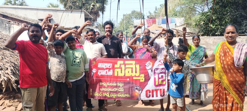 కార్మిక ,రైతు సమస్యల పరిష్కారానికై ఫిబ్రవరి 12 దేశవ్యాప్త సమ్మెను జయప్రదం చేయాలని హరిపాలెం, తిమ్మరాజుపేట, మడుతురు గ్రామాల్లో బ్రాండ్ ఎక్స్, ఫార్మా, ఉపాధి హామీ ఇతర కార్మికుల ఇంటింటా ప్రచారం నిర్వహించడం జరిగింది. ఈ సందర్భంగా సిఐటియు జిల్లా ప్రధాన కార్యదర్శి ఆర్ శంకర్రావు, రైతు సంఘం జిల్లా అధ్యక్షులు కర్రీ అప్పారావు మాట్లాడుతూ కేంద్రంలో బిజెపి ప్రభుత్వం కార్మికులు, రైతులు పై కక్ష కట్టి రైతులకు కార్మికులకు నష్టదాయకమైన రైతు నల్ల చట్టాలు, లేబర్ కోడ్స్ తీసుకొచ్చి ఉపాధి హామీ చట్టాన్ని రద్దు చేసింది దీనివలన కష్టపడి పనిచేసే కార్మికులు, రైతులు, ఉపాధి కూలీలు తీవ్రంగా నష్టపోతారు ఉన్న చట్టాలను తీసేసి కార్పొరేట్లకు, యాజమాన్యాలకు అనుకూలంగా మార్చుతున్నారు. వీటికి వ్యతిరేకంగా దేశవ్యాప్తంగా జరిగే సమ్మెలో శ్రమ చేసే శ్రామికులందరూ పాల్గొని మన యొక్క నిరసనను తెలియజేయాలని కోరారు .ఈ కార్యక్రమంలో సిఐటియు జిల్లా కార్యదర్శి ఆర్ రాము ,కౌలు రైతు సంఘం నాయకులు కే రామ సదాశివరావు,జె వి వి నాయకులు బొడ్డేడ రామ్ కుమార్, సిఐటియు మండల కన్వీనర్ కే సోమనాయుడు, ఉపాధి కూలీలు నడుపురి సన్యాసిరావు, ఎస్ కన్మనాయుడు ,తదితరులు పాల్గొన్నారు.