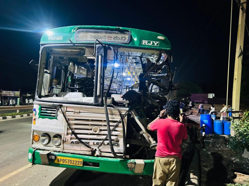 జగ్గంపేట, ఏప్రిల్ 15:కాకినాడ జిల్లా జగ్గంపేట శివారులో బుధవారం సాయంత్రం భారీ రోడ్డు ప్రమాదం తప్పింది. జాతీయ రహదారిపై రామవరం సమీపంలో గల ఆర్.సి.యం చర్చి వద్ద ఆర్టీసీ బస్సు, తాటి దుంగల ట్రాక్టర్ పరస్పరం ఢీకొన్నాయి. తుని డిపోకు చెందిన ఆర్టీసీ బస్సు ప్రయాణికులతో తుని నుండి జగ్గంపేట బస్టాండ్కు వెళ్తుండగా ఈ ఘటన చోటుచేసుకుంది. అదే సమయంలో తాటి దుంగలతో లోడు చేసిన ఒక ట్రాక్టర్ రాంగ్ రూట్లో ప్రయాణిస్తూ, వెనుక ఏముందో గమనించకుండా ఒక్కసారిగా వాహనాన్ని మళ్లించింది. ఈ క్రమంలో వేగంగా వస్తున్న ఆర్టీసీ బస్సు, ట్రాక్టర్ను బలంగా ఢీకొట్టింది. ఈ ప్రమాద ధాటికి ఆర్టీసీ బస్సు ముందు భాగం పూర్తిగా నుజ్జునుజ్జు అయింది. ప్రమాద సమయంలో బస్సులో ఉన్న పలువురు ప్రయాణికులకు స్వల్ప గాయాలయ్యాయి. అదృష్టవశాత్తూ ఎటువంటి ప్రాణనష్టం సంభవించకపోవడంతో అందరూ ఊపిరి పీల్చుకున్నారు. సమాచారం అందుకున్న వెంటనే జగ్గంపేట పోలీసులు ఘటనా స్థలానికి చేరుకున్నారు. గాయపడిన ప్రయాణికులను చికిత్స నిమిత్తం తక్షణమే స్థానిక ఆసుపత్రికి తరలించారు. అనంతరం రోడ్డుపై నిలిచిపోయిన వాహనాలను తొలగించి, ట్రాఫిక్ అంతరాయం కలగకుండా చర్యలు చేపట్టారు. ఈ ఘటనపై పోలీసులు కేసు నమోదు చేసి దర్యాప్తు చేస్తున్నారు.