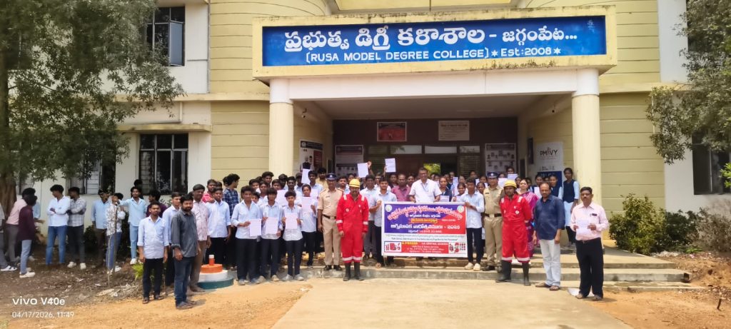 జగ్గంపేట, ఏప్రిల్ 17: జగ్గంపేట ప్రభుత్వ డిగ్రీ కళాశాలలో అగ్నిప్రమాదాల నివారణ మరియు భద్రతా చర్యలపై విద్యార్థులకు అవగాహన సదస్సు ఘనంగా నిర్వహించారు. కళాశాల ప్రిన్సిపాల్ డా. డి. చెన్నారావు అధ్యక్షతన జరిగిన ఈ కార్యక్రమంలో స్థానిక అగ్నిమాపక శాఖ అధికారులు పాల్గొని విద్యార్థులకు కీలక సూచనలు చేశారు.అవగాహన కల్పించిన అగ్నిమాపక సిబ్బందిఈ సందర్భంగా జగ్గంపేట ఇంచార్జ్ స్టేషన్ ఫైర్ ఆఫీసర్ శ్రీ ఆర్. చంద్రశేఖర్, అసిస్టెంట్ ఫైర్ ఆఫీసర్ శ్రీ పి.శ్రీనివాసరావు మరియు వారి సిబ్బంది విద్యార్థులను ఉద్దేశించి ప్రసంగించారు. అగ్నిప్రమాదాలు జరిగినప్పుడు భయాందోళనకు గురికాకుండా సమయస్ఫూర్తితో ఎలా వ్యవహరించాలో వివరించారు. ముఖ్యంగా:ప్రమాద సమయంలో తీసుకోవాల్సిన ప్రాథమిక జాగ్రత్తలు.మంటలను అదుపు చేసే విధానాలు.అగ్నిమాపక పరికరాలను (Fire Extinguishers) ఉపయోగించే తీరుపై ప్రాక్టికల్ డెమో నిర్వహించి విద్యార్థులకు ప్రత్యక్షంగా చూపించారు.ప్రిన్సిపాల్ పిలుపుఅనంతరం ప్రిన్సిపాల్ డా. డి. చెన్నారావు మాట్లాడుతూ, అగ్నిప్రమాదాల పట్ల ప్రతి ఒక్కరూ కనీస అవగాహన కలిగి ఉండాలని కోరారు. ముఖ్యంగా మహిళలు, విద్యార్థులు, ఉపాధ్యాయులు ఇటువంటి ఆకస్మిక ప్రమాదాలు సంభవించినప్పుడు ఆలోచనాత్మకంగా వ్యవహరించి ప్రాణ, ఆస్తి నష్టాలను నివారించాలని సూచించారు.పాల్గొన్న ముఖ్యులుఈ కార్యక్రమంలో కళాశాల వైస్ ప్రిన్సిపల్ శ్రీ సి.హెచ్. బాలరాజు, ఐ.క్యూ.ఏ.సి కో-ఆర్డినేటర్ డా. పి.వి.వి. సత్యనారాయణ, అకడెమిక్ కో-ఆర్డినేటర్ జి. సురేష్ పాల్గొన్నారు. వీరితో పాటు వివిధ విభాగాల అధ్యాపకులు:వి. మల్లికార్జున శర్మ (కెమిస్ట్రీ)డా. డి. సత్యలత (తెలుగు)సి. హెచ్. ఝాన్సీరాణి (గణితం)వి. గోపాలకృష్ణ (ఫిజిక్స్)పి. పద్మ శేఖర్ (కామర్స్)ఆర్. శ్రీను (హిస్టరీ)పి. శ్రీనివాసరావు (జువాలజీ)పి. నవీన (బోటనీ)వి. దేవి ప్రసన్న (కంప్యూటర్ సైన్స్)మరియు ఇతర అధ్యాపకేతర సిబ్బంది, అధిక సంఖ్యలో విద్యార్థిని, విద్యార్థులు ఈ సదస్సులో పాల్గొన్నారు.
