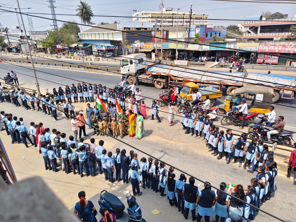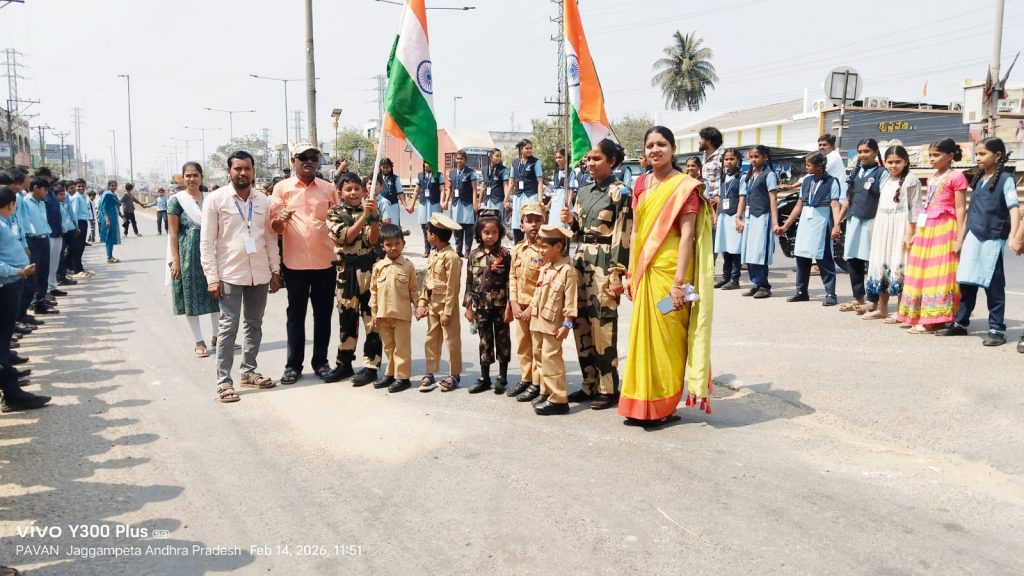 హృదయాలను కదిలించిన ర్యాలీ స్థానిక జే.వి.యర్ (JVR) కాంప్లెక్స్ వద్ద విద్యార్థులు జవాన్ల వేషధారణలో, చేతుల్లో జాతీయ జెండాలు పట్టుకుని నిర్వహించిన ర్యాలీ చూపరులను ఆకట్టుకుంది. ఉగ్రదాడిలో మరణించిన 40 మంది జవాన్ల చిత్రపటాలకు పూలమాలలు వేసి అంజలి ఘటించారు. అనంతరం అక్కడ భారీ మానవహారం నిర్వహించి, ఉగ్రవాదానికి వ్యతిరేకంగా నినాదాలు చేశారు. ఈ సందర్భంగా చైర్మన్ బండారు నాగబాబు మాట్లాడుతూ.. దేశ రక్షణ కోసం సరిహద్దుల్లో ప్రాణాలకు తెగించి పోరాడుతున్న జవాన్ల పట్ల ప్రతి ఒక్కరూ కృతజ్ఞతతో ఉండాలని కోరారు. ప్రాణత్యాగం చేసిన జవాన్ల కుటుంబాలకు ప్రభుత్వం అన్ని విధాలా అండగా నిలవాలని డిమాండ్ చేశారు. విద్యార్థి దశ నుంచే పిల్లలలో దేశభక్తి భావాన్ని, బాధ్యతను పెంపొందించాల్సిన అవసరం ఉందని ఆయన పేర్కొన్నారు.ఈ కార్యక్రమంలో విద్యా సంస్థల డైరెక్టర్ తుమ్మల శ్వేత, కాలేజీ ప్రిన్సిపాల్ కె.అభి, ప్రైమరీ స్కూల్ ప్రిన్సిపాల్ తోట నాగలక్ష్మి, ఇంచార్జీలు కొల్లా శ్రీనివాస్, పులిగ పవన్, బాలిన అరుణ దేవి, శ్రావణి మరియు ఉపాధ్యాయ బృందం, విద్యార్థులు పెద్ద సంఖ్యలో పాల్గొన్నారు .
