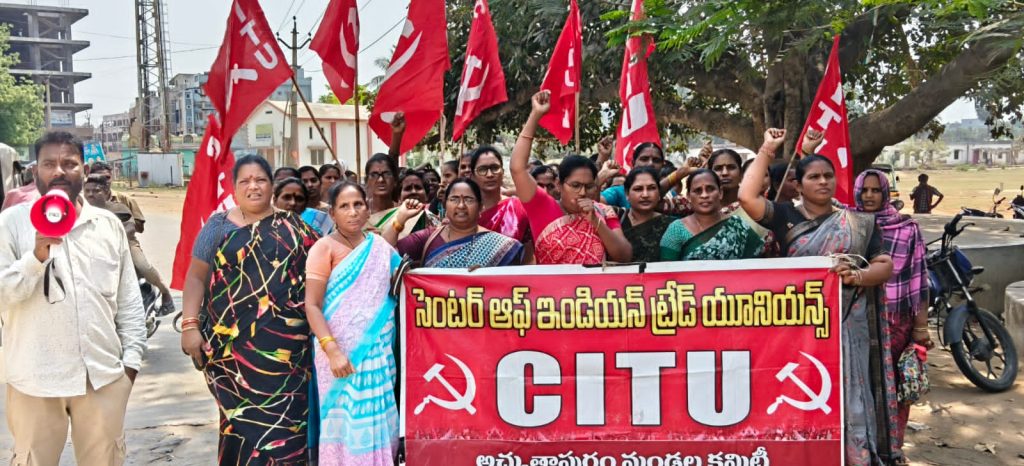 అంగన్వాడి సమస్యలపై నిన్న చలో విజయవాడ వెళ్లిన అంగన్వాడి టీచర్లు ,ఆయాలు శాంతియుతంగా ధర్నా చేస్తున్న వారిపై ఈరోజు తెల్లవారుజామున 5 గంటలకు టెంట్లు లాగి బ్యానర్లు చింపి అంగన్వాడీ టీచర్లు ,ఆయాలపై నిర్బంధం ప్రయోగించి అక్రమ అరెస్టులకు పాల్పడింది దీనిని నిరసిస్తూ ఈరోజు అచ్యుతాపురం ఎమ్మార్వో ఆఫీస్ వద్ద నుంచి ర్యాలీగా వెళ్లి నాలుగు రోడ్లు జంక్షన్ వద్ద నిరసన తెలియజేయడం జరిగింది .ఈ సందర్భంగా సిఐటియు మండల కన్వీనర్ కూండ్రపు సోము నాయుడు , అచ్చుతాపురం అంగనవాడి హెల్పర్ వర్కర్స్ యూనియన్ మండల కార్యదర్శి పి నారాయణమ్మ మాట్లాడుతూ ప్రతిపక్షంలో ఉన్నప్పుడు 42 రోజులు అంగన్వాడీలు సమ్మె చేసిన సందర్భంగా స్వయంగా లోకేష్ టెంట్ దగ్గరకు వచ్చి మేము అధికారంలోకి వస్తే వేతనాలు ఇతర సమస్యలు పరిష్కరిస్తామని హామీ ఇచ్చి రెండు సంవత్సరాల దగ్గర పడుతున్న నేటికీ పరిష్కరించలేదని గతంలో ఇచ్చిన హామీను వెంటనే అమలు చేసి అంగన్వాడీ టీచర్లు ఆయాలకు వేతనాల పెంచాలని మహిళలను అక్రమంగా అరెస్టు చేయడం అన్యాయమని వెంటనే అరెస్టు చేసిన వారిని విడుదల చేసి మా న్యాయమైన సమస్యలు పరిష్కరించాలని కోరారు. ఈ కార్యక్రమంలో ఎన్ వరలక్ష్మి, ఎం కృప, జె పద్మ, ఎం అంబిక, ఆర్ సత్యవతి తదితరులు పాల్గొన్నారు.